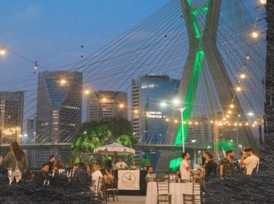 Restaurante a céu aberto com vista para cartão postal paulistano